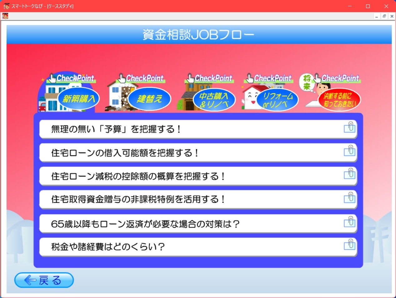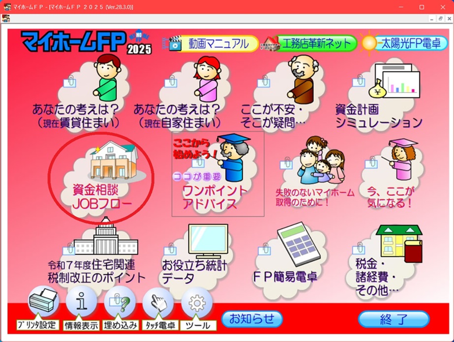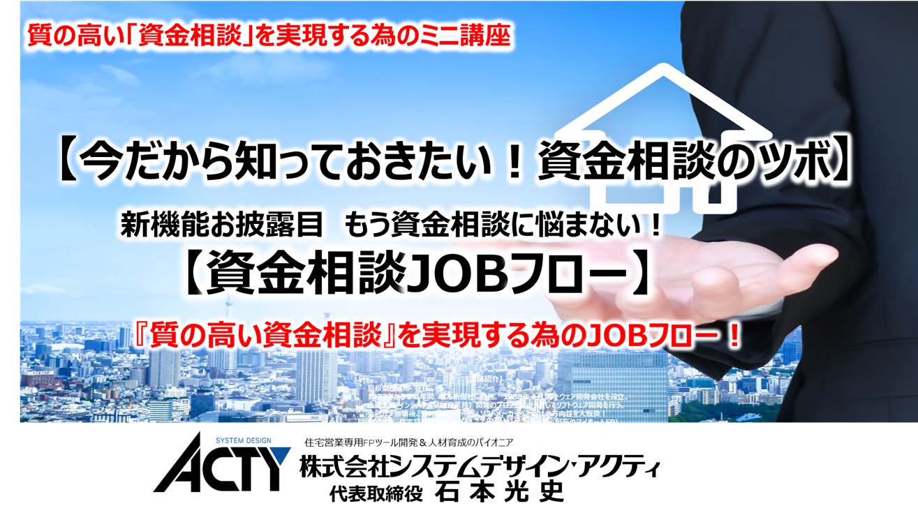 | 「今だから知っておきたい!資金相談のツボ」 住宅価格は、物価高+高性能住宅推進により益々上昇しています! そのような状況の中では、マイホーム購入の考え方も多様化します。 新築住宅(注文・分譲)、買取再販住宅、中古住宅、中古+リノベ、自宅のリフォーム(リノベ) 拘りたいが・・予算が・・・(-_-;) もう少し待つか? 悩みは、次から次へと・・決断出来ないお客様が増えています!そんな時代において「質の高い資金相談」を可能にするマイホームFP! お客様の質問、不安・疑問に素早く対応するスキルを身に付けた人は強い!マイホームFPは、100以上のシミュレーションを搭載しています。 個別のシミュレーションは、時代に合わせて進化・高度化しています。 そも豊富な機能を十二分に活用して成果を上げている人がいます。 また、活用できていない人もいます!その差は、「ストーリー」を理解しているか? お客様と信頼関係を早く構築するにはどうするか? 資金相談は、何からスタートすれば良いか? このような悩みを解消します! 【資金相談JOBフロー】コーナーを新設しました。